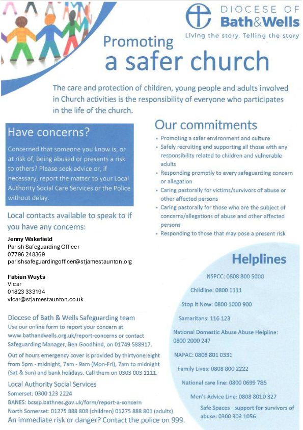 At St James we take our safeguarding responsibility VERY seriously and we follow the safeguarding policy of the Church of England and the Diocese of Bath and Wells. In our church community our aims is to make our activities safe for children, young people and vulnerable adults and to ensure that all our members are cared for and respected.